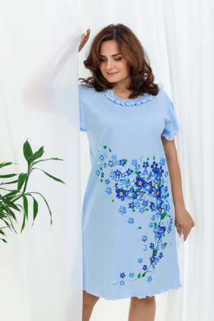 Сорочка женская с симпатичной рюшей по горловине. Очень свободный и удобный крой. Рукав - реглан не стесняет движения рук. Обработка рукава и низа изделия в виде лёгкой волны придаёт лёгкость и воздушность. Шикарный принт в виде россыпи незабудок. Оттенок ментола может отличаться от фото