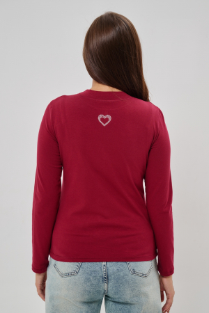 Женский лонгслив из высококачественной кулирки обладающий умеренно приталенным силуэтом и круглым вырезом горловины. Представлен в базовых однотонных цветах, имеет дополнительную градацию размеров для оптимальной посадки. Задняя сторона украшена орнаментом из страз в форме сердца. Универсальная модель для межсезонья, успешно гармонирует с разнообразными элементами гардероба различного стиля.