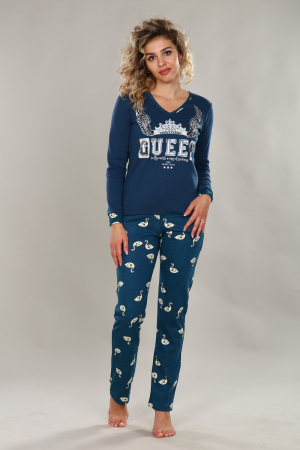 Комплект приталенного силуэта с брюками и кофтой. Кофта с V образным вырезом и декоративной печатью на полочке. Брюки зауженного силуэта на резинке с карманами.