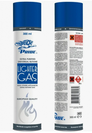 Дополнительно очищенный универсальный газ тм PRIDE для повторной заправки газовых зажигалок.
