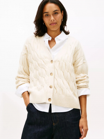 Tommy Hilfiger women's sweater. Sweater season would not be complete without a little something in a cable knit. Made from a soft, stretchy cotton-blend, this V-neck cardigan is an easy, comfortable layer.