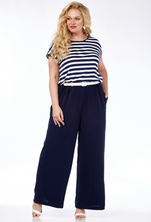 Комбинезон женский( выполнен из двух видов ткани) свободного кроя с застежкой на 1 навесную петлю и пуговицу на горловине спинки. Лиф из трикотажа в полоску с запахом на спинке. Горловина округлой формы. Нижняя часть комбинезона с притачным поясом и резинкой. В боковых швах обработаны карманы. Ремень входит в комплект.