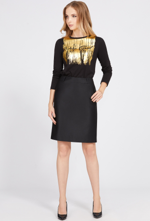 У юбки передняя половина с косыми карманами, в среднем шве задней половины юбки обработаны потайная молния и шлица. На подкладке .