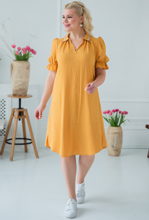 Платье расширенного силуэта с коротким рукавом. Горловина округлая с рубашечным воротником. По спинке V-образный вырез. Рукав со складками по окату и резинкой на расстоянии от низа. Низ закругленный с разрезами по боковым швам.