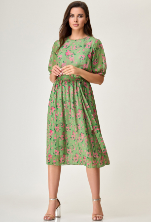 Платье прямого силуэта, отрезное по линии талии и приталенное с помощью резиночки, с юбкой плиссе. Перед с нагрудной вытачкой. В боковых швах шлевки. Горловина круглая, по спинке застежка капелька на одну петлю-пуговку. Рукав втачной со сборкой по окату и по низу с притачной манжетой с застежкой на одну петлю- пуговку. Платье на подкладке. Платье дополнено поясом из основной ткани.