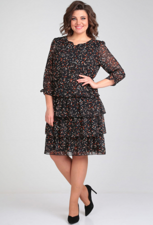 Платье прямого силуэта. отрезанное по линии бедер. Лиф с нагрудными вытачками. Спинка лифа со среднем швом и завязывающимся бантом на горловине. Горловина округлая с отделочной небольшой стойкой. Юбка платья из настрачивающихся присобранных воланов. Рукав одношовный. втачной. Платье на подкладке.