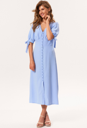 Нежное женское платья прилегающего силуэта, отрезное по линии талии. Перед с фигурной кокеткой и сборкой под грудью. Юбка конической формы длиной ниже линии колена. Вырез горловины глубокий. V-образный. Рукав втачной со сборкой по линии отката и низу. Манжет притачной с завязкой на бант. Платье с застежкой на петли и пуговицы.