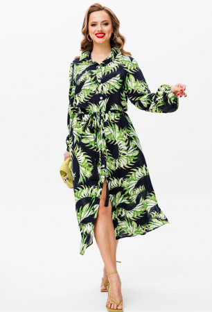 Элегантное женское платье из текстильной ткани. Модель прямого силуэта, отрезная по линии талии. В верхней части полочки идут грудные выточки из бокового шва. Застежка планка на петли и пуговицы до низа. Воротник на отрезной стойке. По линии талии идет кулиска с тесьмой. На концах тесьмы - отделка в виде бахромы. В платье по бокам - разрезы. Рукав длинный на резинке.
