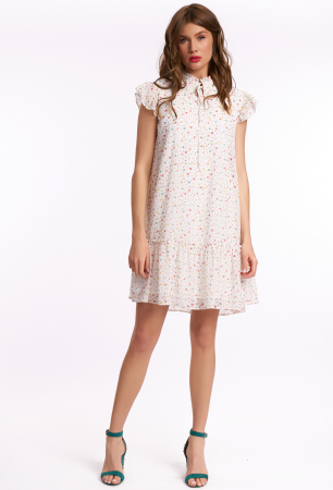 Лёгкое женское платье умеренного объема, расширенное к низу. Перед с разрезом по горловине. Рукав «крылышко» на сборке. Воротник стойка с притачной рюшей по верху и завязками. Низ платья с настрочным воланом. Платье на вискозной подкладке, длиной до линии колена.