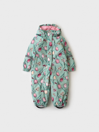 Лёгкий демисезонный комбинезон для новорождённой девочки. Температурный режим от +15 до 0С. Ткань с мембранным покрытием 5000х5000. Внутри трикотажная подкладка. Комбинезон застёгивается на косую молнию, которая закрыта ветрозащитной планкой на липучках. Капюшон съёмный, застёгивается на кнопки и фиксируется липучкой сзади. Боковые карманы. На рукавах и штанинах есть светоотражающие полосы, а низ собран на резинку. Внизу предусмотрены эластичные штрипки с пуговицами, чтобы комбинезон надёжно держался на обуви. Спинка собрана на внутреннюю резинку для лучшей посадки.