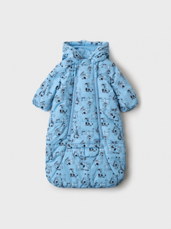 Лёгкий демисезонный конверт для мальчика. Температурный режим от +15°C до 0°C. Ткань верха с ветрозащитным и водоотталкивающим покрытием. Внутри мягкая трикотажная подкладка. Яркий голубой цвет с весёлым принтом собачек и надписями. У конверта две длинные молнии спереди, благодаря которым он полностью раскрывается — удобно при переодевании. Есть капюшон с утяжками, светоотражающая вставка для безопасности, а также специальная прорезь на спинке для использования в автолюльке. Рукава с возможностью превратить их в варежки.