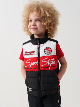 Детский жилет для мальчика. Температурный режим от +15°C до 0°C. Ткань верха с ветрозащитным и водоотталкивающим покрытием. Внутри гладкая подкладка. Проймы обработаны эластичной тесьмой, что обеспечивает комфортную посадку. По бокам два удобных кармана на молнии. Внутренний карман на липучке. На спинке — светоотражающая нашивка для безопасности.