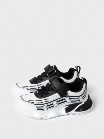 Кроссовки для мальчика с подошвой с LED-подсветкой Кроссовки выполнены из дышащего текстиля и искусственной кожи с повышенной износостойкостью. Эластичные шнурки и липучка создают удобство при обувании. Профилированная съемная стелька из натуральной кожи с анатомической формой подсводника обеспечивает правильную нагрузку на стопу. В носочной части обуви стоит текстильная подкладка c высоким содержанием хлопка 80%, которая обладает высокой гигроскопичностью. В пяточной части обуви текстильная подкладка обладает хорошей износостойкостью. Кроссовки имеют светоотражающие элементы. Формоустойчивый задник поддерживает стопу в правильном положении. Эргономичная форма колодки обеспечивает правильное формирование стопы ребенка. Подошва из ЭВА очень легкая.