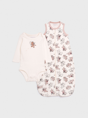 Комплект детский для девочки: боди, спальный мешок. Комплект: боди, спальный мешок из натурального хлопкового двойного трикотажа. Кнопки внизу – 2 ряда, боди растет вместе с малышом. Спальный кокон на молнии.
