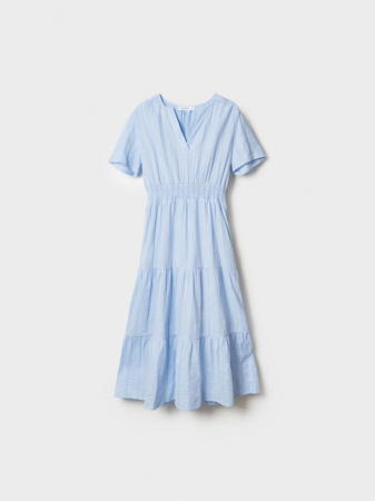 Женское летнее платье в длине миди. Модель имеет широкую резинку по талии. Верхняя часть дополнена подкладкой для комфорта. Хлопковая ткань с тонким фактурным рисунком и цветочными элементами придаёт изделию нежный и воздушный вид. V-образный вырез делает образ более выразительным.