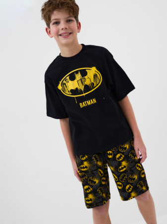 Пижама для мальчика подростка. Комплект состоит из чёрной оверсайз футболки и шорт. На футболке спереди крупный яркий принт с логотипом Бэтмен. Шорты украшены ярким принтом с логотипами. Шорты средней длины, с удобным эластичным поясом и шнурком для регулировки. Материал - хлопковый, мягкий трикотаж.