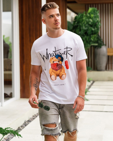 Мужская футболка имеет стандартный крой. Если хотите, чтобы она сидела по фигуре, как на фото, берите свой размер, ориентируясь на таблицу. Если хочется эффекта оверсайз или немного свободной посадки, выбирайте на размер или два больше.