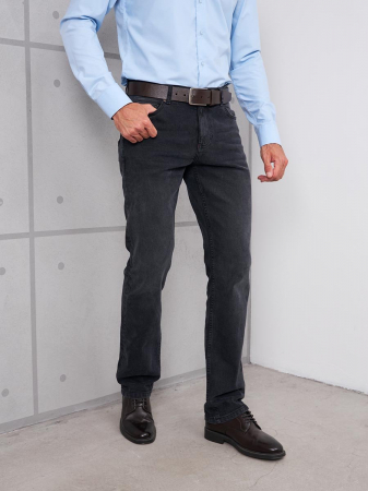 Мужские модные джинсы с пятью карманами. Посадка Slim fit (облегающие по бедру), средняя талия спереди, высокая сзади. Застежка на молнии. Немного зауженные к низу. Боковой шов сделан в разутюжку. Выполнены из слабоэластичной ткани denim comfort stretch, цвет ткани Black/Black (лицевая и изнаночная стороны ткани черные). Средняя стирка с потёртостями и "усами" спереди и потёртостями сзади. Основной оттенок ткани после стирки темно-серый.