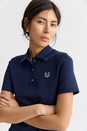 Джемпер-поло в благородном оттенке с вышивкой. Модель полуприлегающего силуэта. Воротник-поло с застежкой на пуговицы. Рукав втачной, короткий.