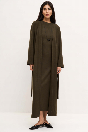 Кардиган из мягкого трикотажного полотна длины макси. Модель свободного силуэта. Рукав спущенный, свободный. В боковых швах шлевки. В комплекте пояс из основной ткани.