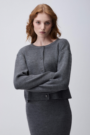Уютный кардиган из смесовой пряжи. Модель свободного силуэта. Рукав расширенный, прямой. По переду застежка на петли и акцентные, металлические пуговицы.