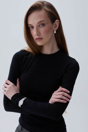 Базовый лонгслив из мягкого вискозного трикотажа. Модель прилегающая с втачным рукавом, круглая горловина.