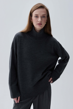 Базовый свитер из шерсти. Модель свободного силуэта. Рукав спущенный. Воротник- стойка. Резинка на рукавах и по низу изделия.