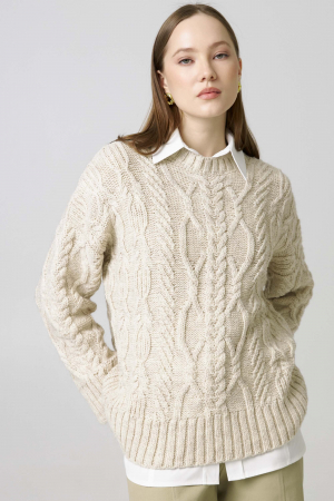 Уютный джемпер из смесовой пряжи с шерстью. Модель свободного силуэта со спущенной линией плеча. Вязка косами. Круглый вырез. Резинка на рукавах и по низу изделия.