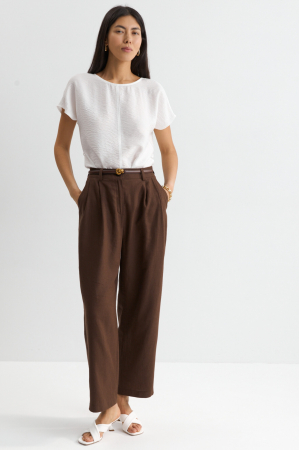 Брюки трендового силуэта barrel из льняного полотна. Модель свободного, зауженного к низу силуэта. По переду защипы, боковые карманы, гульфик. Застежка на молнию и пуговицу.