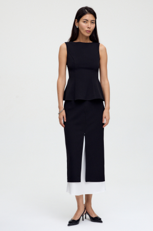 Двойная юбка с регулирующимся разрезом. Модель состоит из двух юбок. Нижняя часть из атласа на резинке, легкого А-силуэта. Верхняя часть прямого силуэта, на обтачке, из плотного костюмного полотна, с разрезом и потайной молнией по переду.