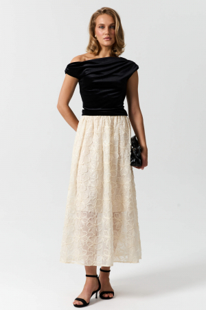Юбка из креш-шифона с объемными цветами и пайетками. Модель свободного силуэта со сборкой и притачным поясом из атласа компаньона. По спинке эластичная резинка. Изделие на подкладе.