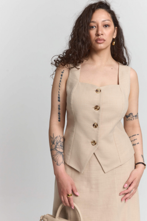 Жилет приталенного силуэта из благородного фактурного хлопка на подкладе с фигурной линией выреза груди, фигурным низом и рельефами, застежка на пуговицы. Идеально моделирует силуэт "песочные часы".