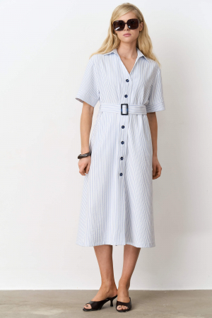 Элегантное платье длины миди в полоску. Модель отрезная по линии талии, умеренно расклешенная к низу. По переду застежка на петли и пуговицы и карманы. В комплекте пояс из основной ткани с пряжкой.
