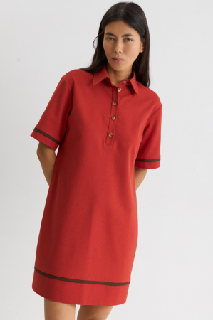 Платье из льняного полотна с контрастной отделкой. Модель прямого силуэта. Рубашечный воротник. Короткий рукав, слегка спущенное плечо. Низ рукава и изделия отделаны контрастным кантом.