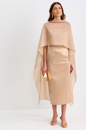 Платье футляр в длине миди с шарфом-кейпом. Модель полуприлегающего силуэта, отрезная по линии талии. Бретели регулируемые. По спинке разрез и застежка на потайную молнию. Изделие на подкладе. Шарф-кейп с застежкой на воздушную петлю и пуговицу.