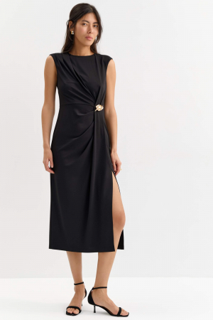 Элегантное платье для любого случая из трикотажного полотна. Модель прямого силуэта, отрезная по линии талии с деликатной линии плеча. По переду асимметричные драпирующиеся складки. Декоративная съемная брошь в комплекте. По спинке застежка на пуговицу.