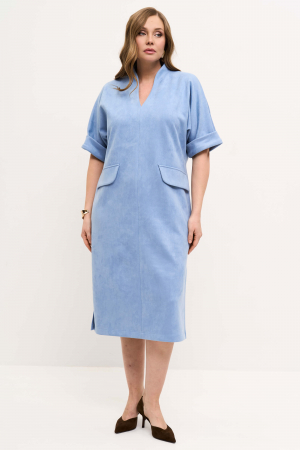 Комфортное платье нежного оттенка из эко-замши. Модель прямого, слегка свободного силуэта. Цельнокроеный рукав и широкие манжеты, воротник-стойка, разрезы по бокам, ложные карманы. Длина миди.