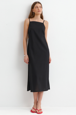 Сарафан базового цвета из льняного полотна. Модель свободного прямого силуэта. Тонкий пояс из основного материала, вшит в боковые швы. Разрезы по бокам. Бретели регулируемые. Пояс можно обернуть вокруг талии и завязать спереди.