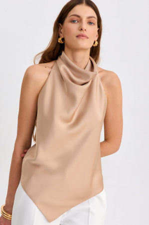 Элегантная блуза из атласа. Модель полуприлегающего силуэта с ассиметричным низом по переду. Ворот заложен в красивую складку. Застежка по спинке на декоративные пуговицы.