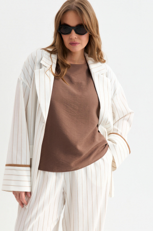 Облегченный жакет в полоску из льняного полотна. Модель свободного силуэта со спущенной линией плеча. Отложной воротник. По переду декоративные клапана. Рукав на широкой манжете, оформленной контрастным кантом.