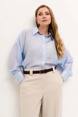 Свободная блуза- рубашка со спущенным плечом. Застежка на пуговицы и петли, отложной воротник на стойке, фигурный низ, на спинке кокетка и складка. Рукава с манжетами.