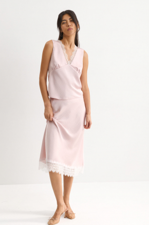 Юбка из мягкого крэш-атласа актуальной длины с кружевом. Модель полуприлегающего силуэта, выкроенная по косой. Изделие на обтачке с внутренней мягкой резиной. Низ изделия оформлен французским кружевом.