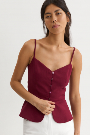 Романтичный топ на бретелях с аккуратной баской. Модель прилегающего силуэта. Отрезная линия талии с баской. По переду и спинке рельефные швы. Застежка на воздушные петли и пуговицы. Тонкие регулируемые бретели.