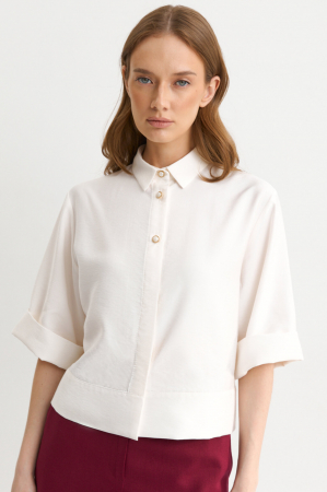 Укороченная блуза-рубашка с закрытой планкой из лиоцелла. Модель свободного силуэта. Рукав втачной короткий с манжетой. По переду застежка с акцентными пуговицами переходящая в супатную. По низу изделия широкая декоративная подгибка.