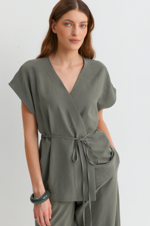Комфортная блуза из лиоцелла в благородном оттенке. Модель свободного силуэта на запах. Рукав спущенный. Застежка внутренняя завязка, по линии талии фиксируется тонким поясом из основной ткани.