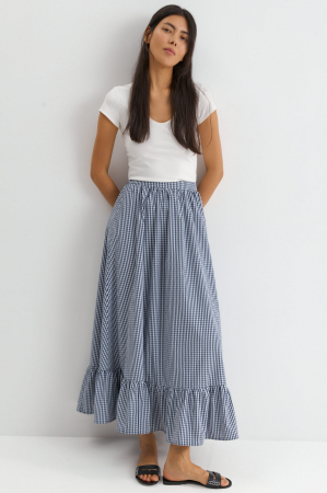 Акцентная юбка длины макси с воланом. Модель свободного А-силуэта на притачном поясе. По спинке резинка для комфортной посадки. По низу широкий волан на легкой сборке.