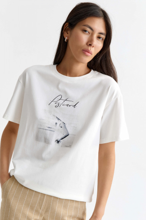 Комфортная футболка с авторским принтом из трикотажного полотна. Модель свободного силуэта. Рукав короткий. Горловина обработана бейкой.