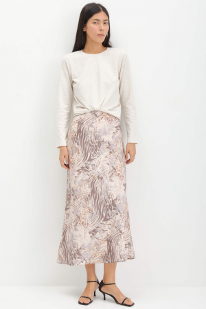 Юбка длины миди с принтом из фактурной вискозы. Модель полуприлегающего силуэта, скроенная по косой для идеальной посадки. Изделие на обтачке с внутренней мягкой резиной.