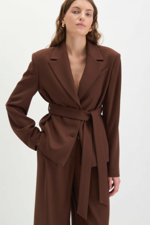 Жакет в шоколадном оттенке актуального кроя. Модель прямого силуэта с английским воротником. Застежка на пуговицы. Рукав слегка спущенный. В комплекте пояс на шлевках для формирования красивого силуэта. Карманы в рельефах по переду.