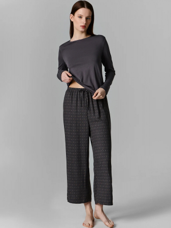 Комплект женский состоит из джемпера и бридж. Джемпер прямого силуэта. Горловина овальной формы окантована бейкой из основного полотна в чистый край. Рукава втачные длинные. Нижний срез джемпера и рукавов обработан швом вподгибку. Бриджи прямые свободные, короткие. Пояс цельнокроеный с эластичной тесьмой внутри (внутр. 20мм 20RV). По переду пробиты петли и втянут шнур-бейка из основного полотна. Нижний срез обработан швом вподгибку с закрытым срезом.